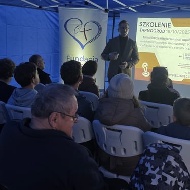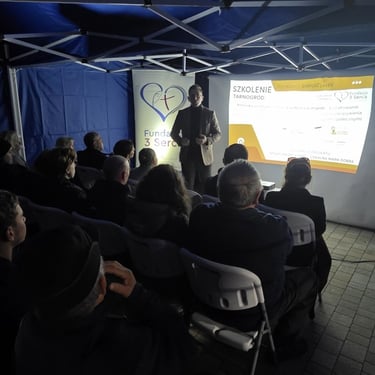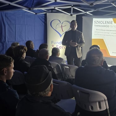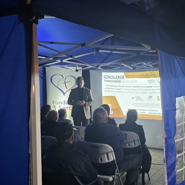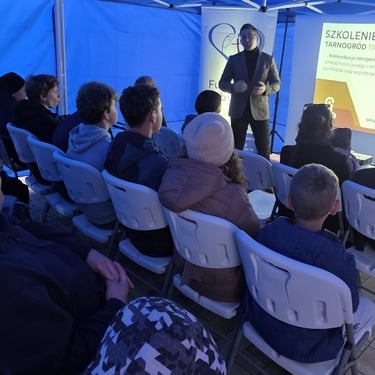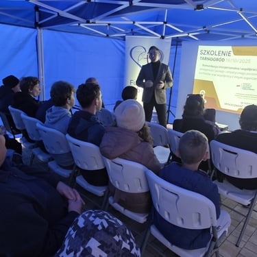 Szkolenie odbyło się z wykorzystaniem namiotu oraz sprzętu zakupionego w ramach projektu „Społeczność 3 Serc – Lokalna Mapa Dobra”, co pozwoliło zapewnić komfortowe i profesjonalne warunki do pracy warsztatowej. Dzięki nowemu wyposażeniu możliwe było sprawne zorganizowanie przestrzeni szkoleniowej oraz stworzenie przyjaznej atmosfery sprzyjającej współpracy i integracji uczestników.